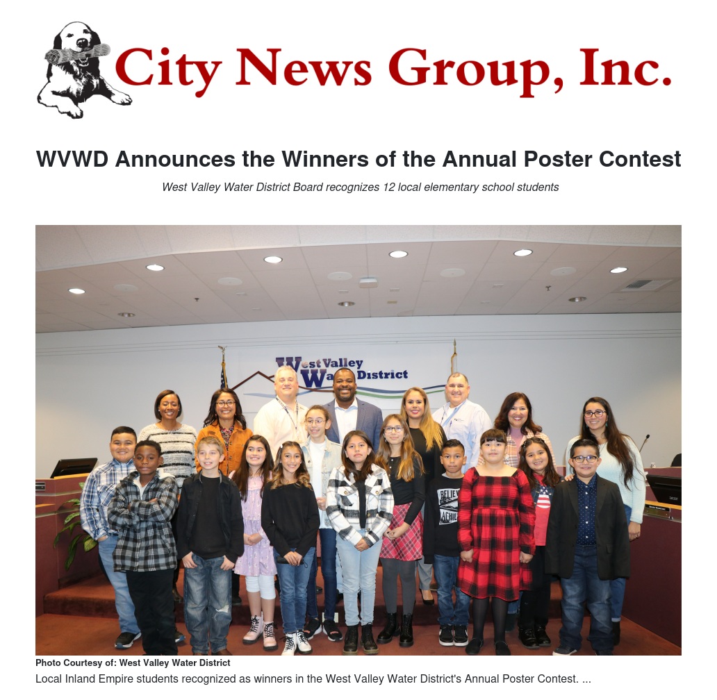 The West Valley Water District (WVWD) Board of Directors announced the winners of the annual poster contest during its December 1st board meeting.