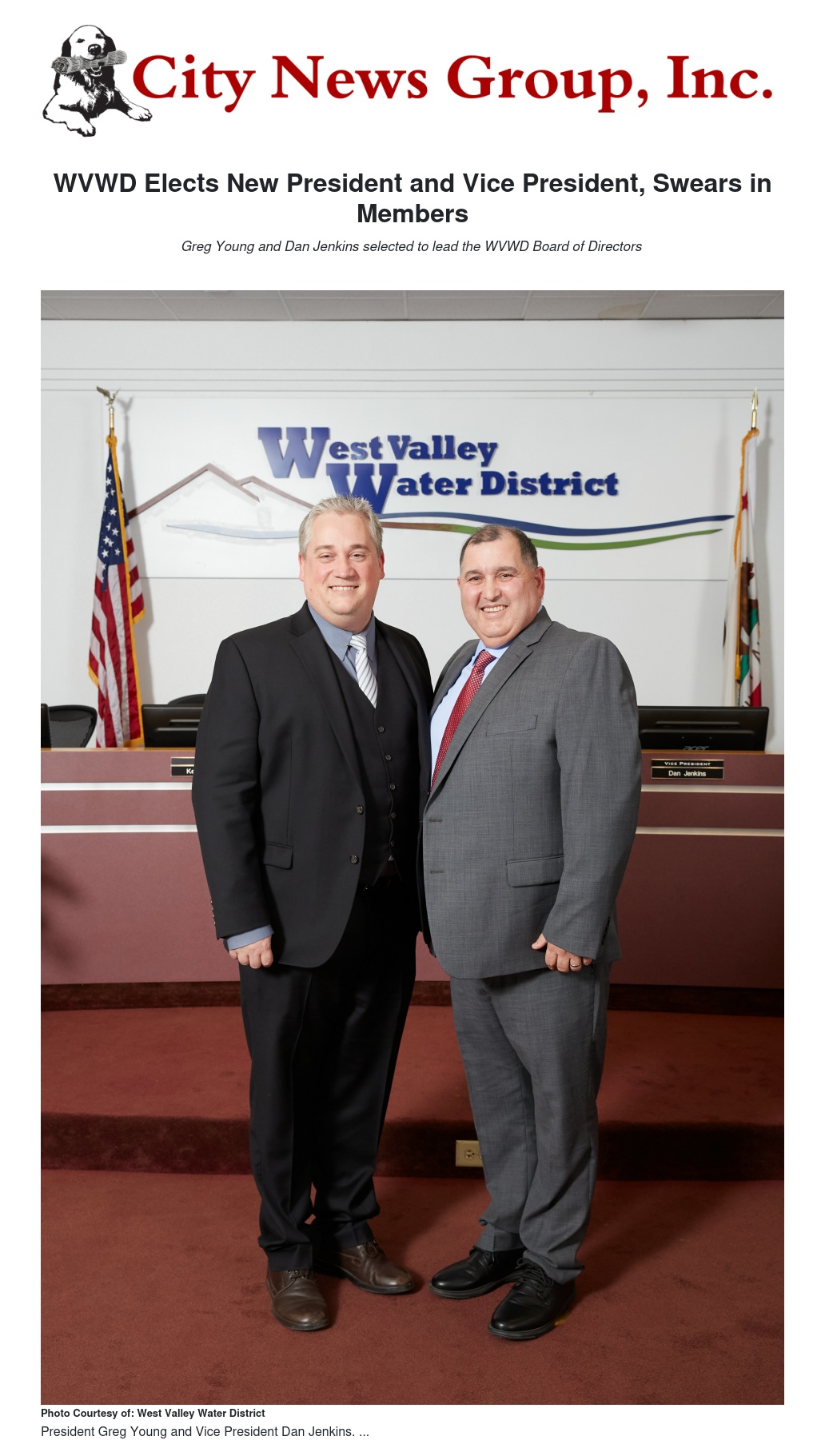 The West Valley Water District (WVWD) Board of Directors has elected Greg Young as the new President of the board and Dan Jenkins as it's Vice President. Additionally, three members of the board were sworn in during the December 15 board meeting.