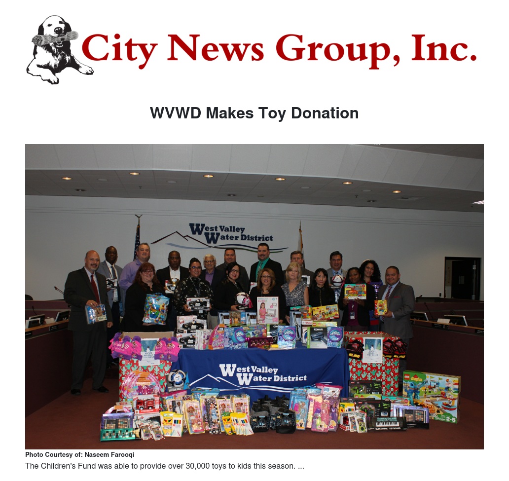 The West Valley Water District Board of Directors made a holiday toy donation to the Children’s Fund. The Board recognized the efforts of the Children’s Fund which serves the most vulnerable children in our society and partnered in spreading holiday cheer.
